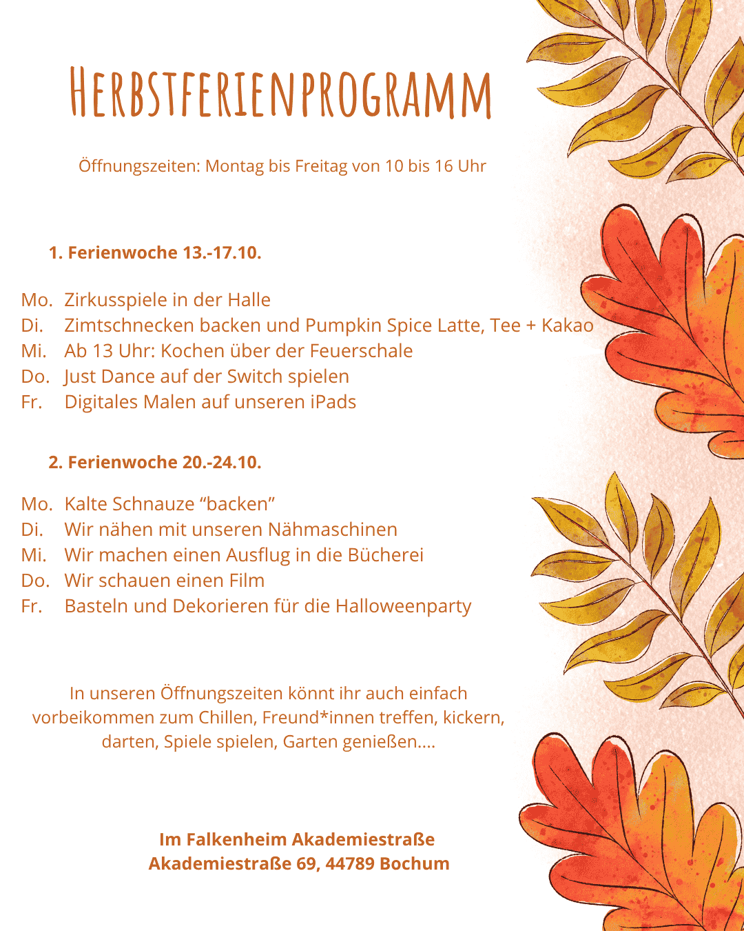 Herbstferienprogramm 2025 Unser Ferienprogramm in den Herbstferien 2025. Wir freuen uns auf euch! 2025-10-08T15:39:10+02:008. Oktober 2025|